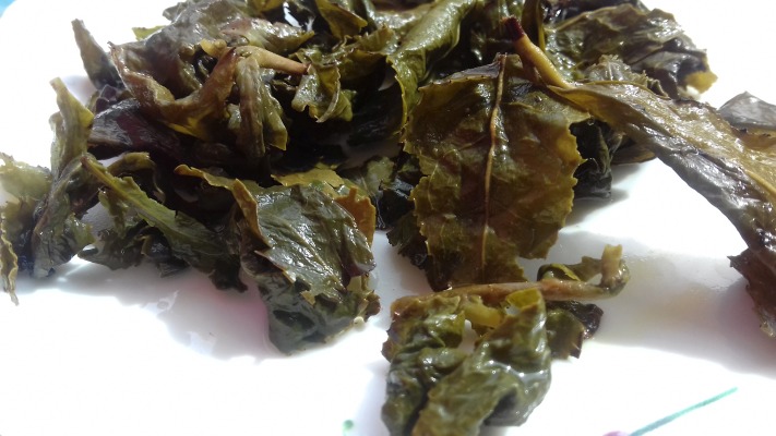 Parzenie trzecie: mleczność nadal wyczuwalna. W głębi smaku ślad pischingera, choć bez jego słodyczy- ot takie skojarzenie. Napar nadal słonecznie żółty, choć same liście, pozostawione na talerzyku, wydzielają z siebie napar żywo- zielonego koloru. Smak łagodny, miły. Liście duże, ciemnozielone, rozwinięte całkowicie.Liść jest gruby i mięsisty. Rozgryza się go z pewną trudnością, Smak soku jest jednocześnie lekko gorzkawy ale i świeżo cytrusowy. Lekki posmak marakui, a może papai? Egzotycznie, nie spodziewałabym się. Generalnie: zakochałam się w tej herbacie!