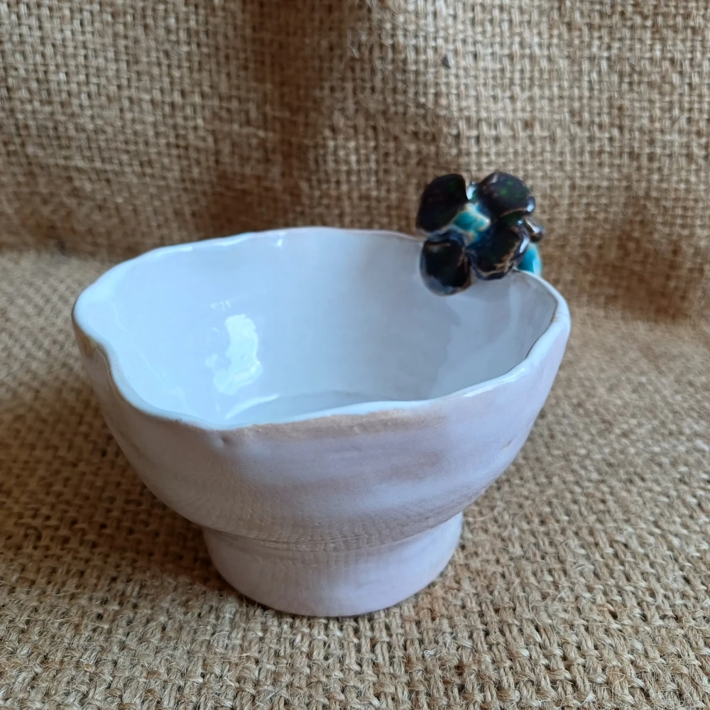 Ręcznie formowana filiżanka do kawy lub herbaty o kształcie kwiatu z uchem zakończonym kwiatkami w kontrastowej do całości barwie. W środku biel, na zewnątrz delikatny róż. Piękny prezent na każdą okazję, szczególnie dla miłośników powolnego delektowania się dobrą kawą, aromatyczną herbatą.