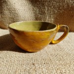 Ręcznie formowana filiżanka do kawy lub herbaty o przyjemnym kształcie i zdobieniu. Oliwkowo- butelkowa zieleń wewnątrz pięknie uzupełnia się z żółtością strony zewnętrznej i kolorystycznie pasuje do naparu z zielonej herbaty i każdej pysznej kawy. Piękny prezent na każdą okazję.