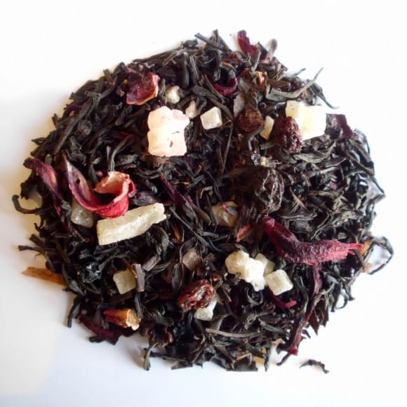 Skład: Herbata czarna Ceylon, ananas kandyz. (ananas, cukier, substancja konserwująca SO2), hibiskus, rodzynki (rodzynki, olej słonecznikowy, substancja konserwująca E220), czarny bez, wiśnia kandyzowana (wiśnia, cukier, syrop glukozowy. Mąka ryżowa, regulator kwasowości E330, substancja konserwująca E202, aromat, barwnik E129), aromat.