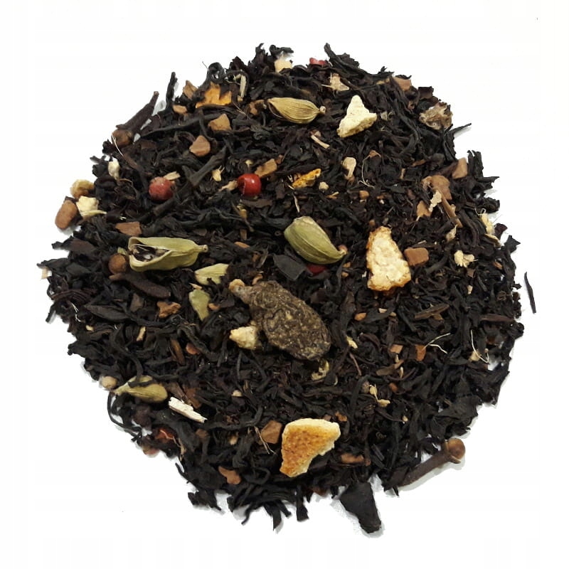 Skład: herbata czarna, cynamon, kardamon, rodzynki (rodzynki, olej słonecznikowy, substancja konserwująca e220), imbir, goździk, pomarańcza kandyz. (skórka pomarańczowa, cukier, syrop glukozowy, regulator kwasowości e330, substancja konserwująca e202, aromat), skórka pomarańczy, pieprz, lukrecja.