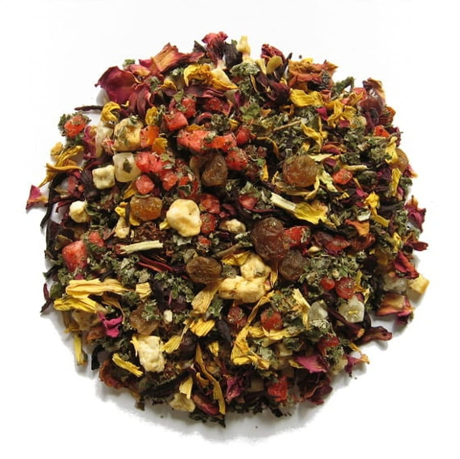Skład: hibiskus, jabłko, pomarańcza kandyzowana (skórka pomarańczowa, cukier, syrop glukozowy, regulator kwasowości E330, substancja konserwująca E202, aromat), rodzynki (rodzynki, olej słonecznikowy, substancja konserwująca E220), ananas kandyzowany (ananas, cukier, substancja konserwująca SO2), Honey Bush, skórka róży, liść maliny, płatki róży, nagietek, aromat.