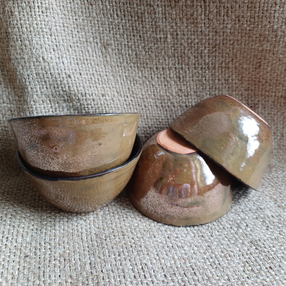 Komplet dużych czarek ceramiczna do herbaty, o pojemności 125 ml. Ręcznie formowane, zdobione i szkliwione. Środek czarny, strona zewnętrzna złotawo- miedziano- brązowa w zależności od światła.