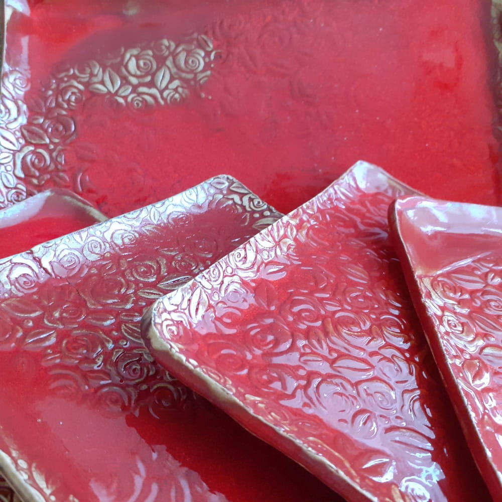 Widoczny na zdjęciu zestaw talerzyków ceramicznych jest niepowtarzalny, tak jak niepowtarzalna jest natura. Komplet ceramiki do sushi przyda się zarówno podczas spotkania przy kawie, herbacie i ciastku, ale również jako tło dla prezentacji miniaturowych dzieł sztuki, jakimi bywają rolki sushi. Żywe barwy rozweselają, różany wzór ociepla atmosferę.