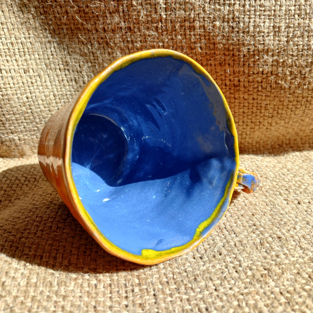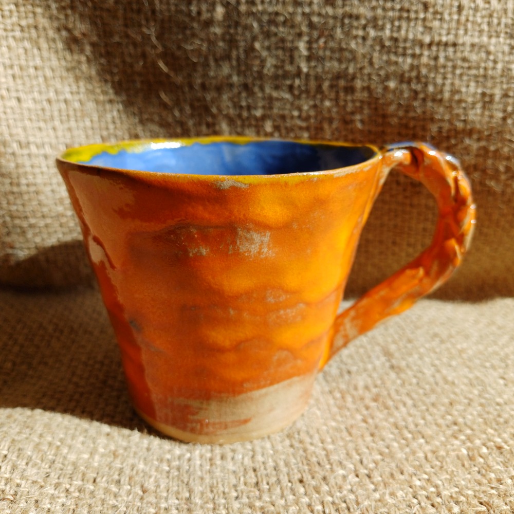 Klasyczny, lekko rozszerzony do góry kubek, zdobiony szkliwami o intensywnych, energetycznych barwach. Ciekawe, plecione ucho dodaje charakteru całości. Jedyny taki egzemplarz. Sygnowany pieczątką firmową. Pojemność 210 ml