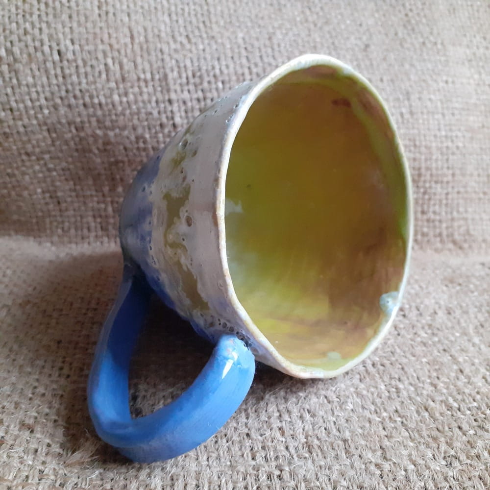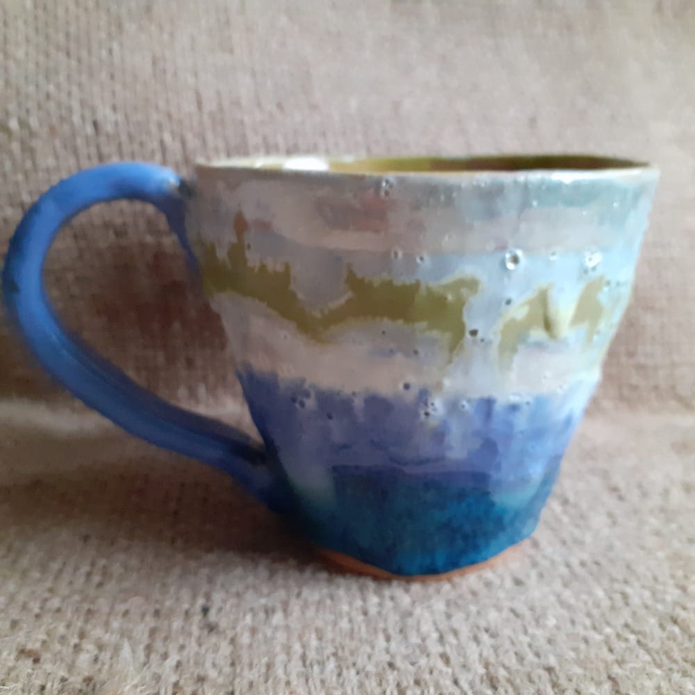 Kubek ceramiczny o klasycznym kształcie z przyjemnie trawiastym wnętrzem. Na zewnątrz krajobrazy przywodzące na myśl mglisty świt nad rzeką. Pijąc z niego łatwo połączymy przyjemność wizualną i smakową.