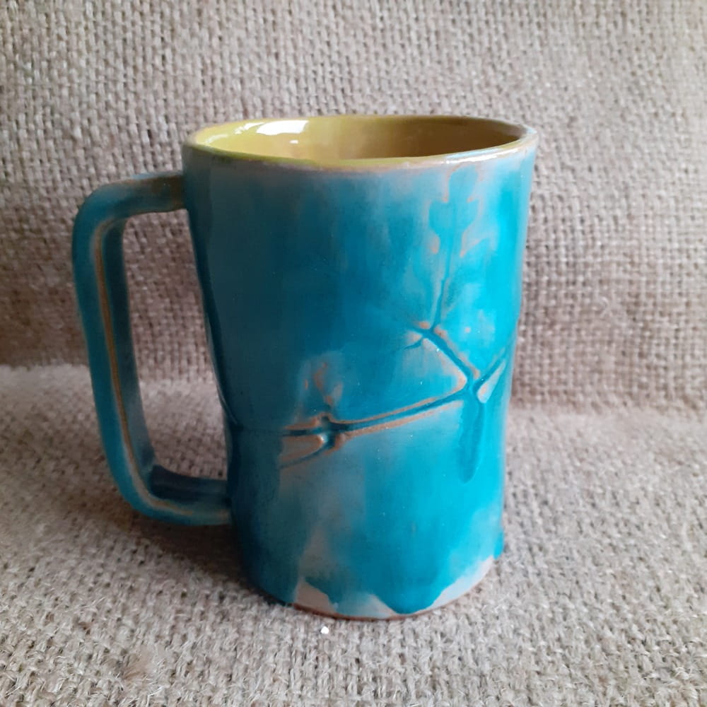 Kubek ceramiczny w kształcie walca z przyjemnie trawiastym wnętrzem. Na zewnątrz roślinny wzór ozdobiony turkusowym szkliwem.