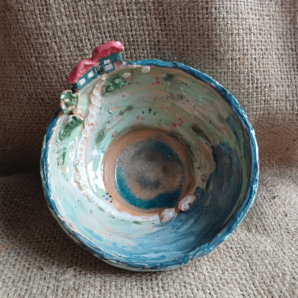 Miska o o węższej podstawie, na wysokości 2 cm rozszerzająca się wyraźnie. Zdobiona zarówno strukturą jak i barwą. Jest w niej przedstawiony mały, sielski świat domków położonych nad jeziorem zasilanym turkusowym strumieniem do którego to jeziorka prowadzi stroma ścieżka. Do miski można wstawić świecę o średnicy do 5 cm i cieszyć się grą świateł w naszym małym bajkowym świecie.