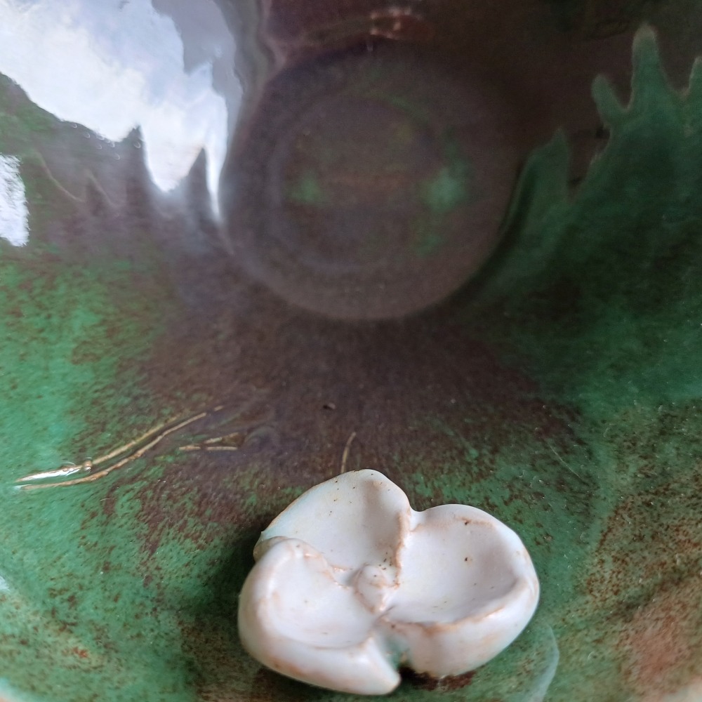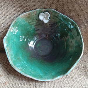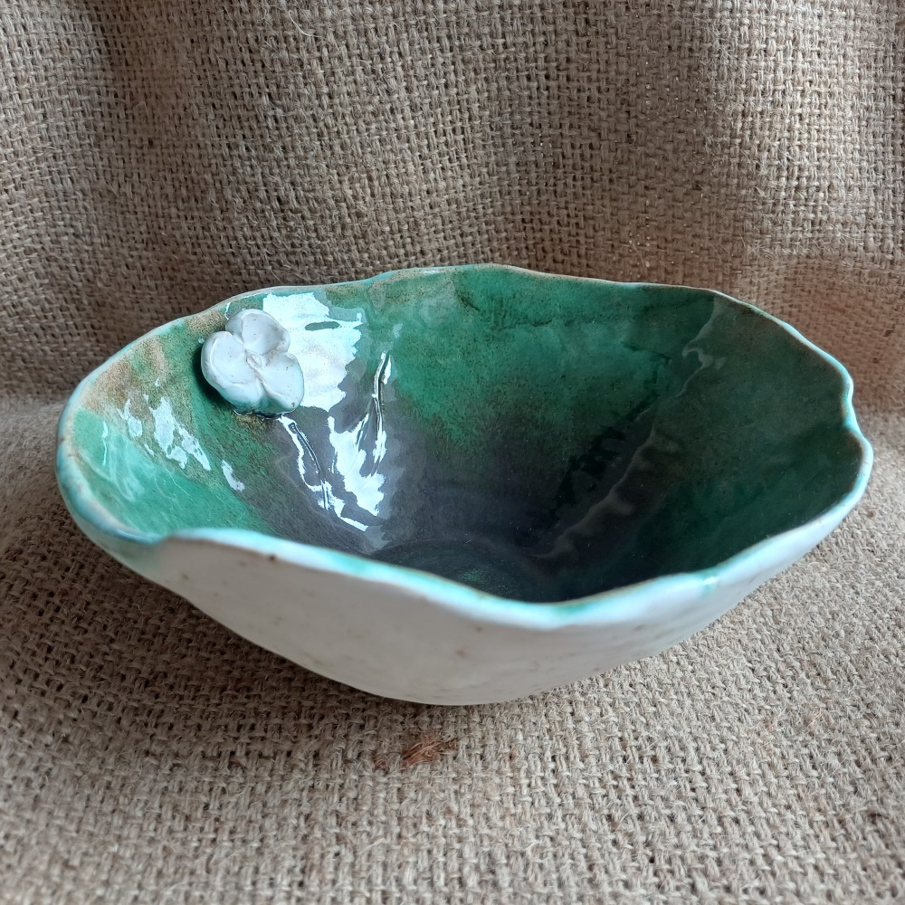 Miska o harmonijnym kształcie i zdobieniu. Barwy utrzymane w pięknych, głębokich zieleniach z akcentem białego kwiatu. Miska ceramiczna jest ręcznie robiona i zdobiona ciemno zielonym szkliwem o barwach leśnego mchu i poszycia. Na zewnątrz przyjemne w dotyku, pół matowe szkliwo o białej barwie z brązowymi akcentami. Pojedynczy egzemplarz, sygnowana pieczątką firmową.
