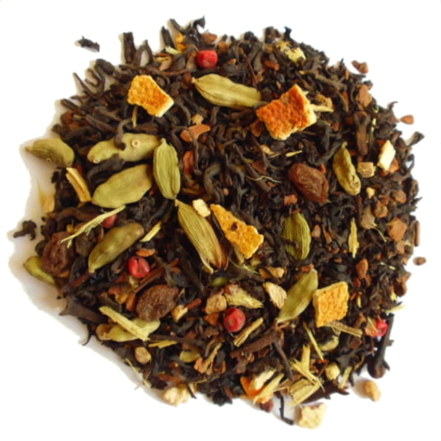 Skład: herbata czerwona, cynamon, kardamon, imbir, rodzynki (rodzynki, olej słonecznikowy, substancja konserwująca E220), lukrecja, goździk, skórka pomarańczy, pomarańcza kandyzowana (skórka pomarańczowa, cukier, syrop glukozowy, regulator kwasowości E330, substancja konserwująca E202, aromat), pieprz.