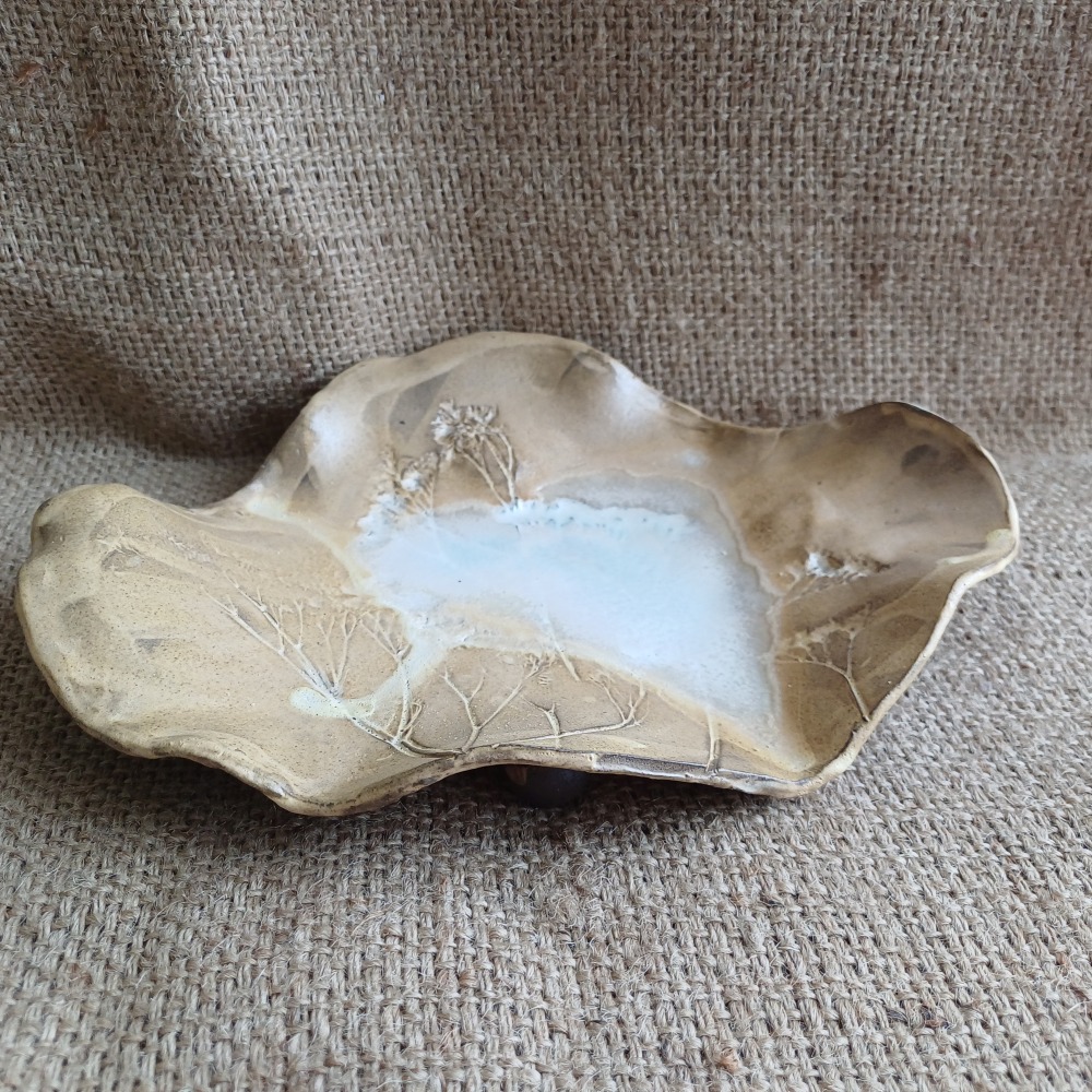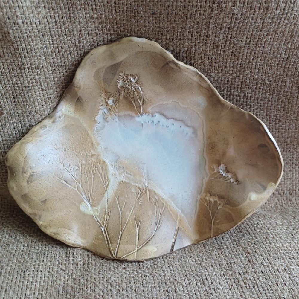 Talerz o wymiarach około 22/ 20 cm, zdobiony fakturą roślinną, powierzchnia lekko falista. Posiada wiele zastosowań: może być talerzem, podstawką pod świecę, paterą. Wykonany z ciemnobrązowej gliny szkliwiony perłowym szkliwem.