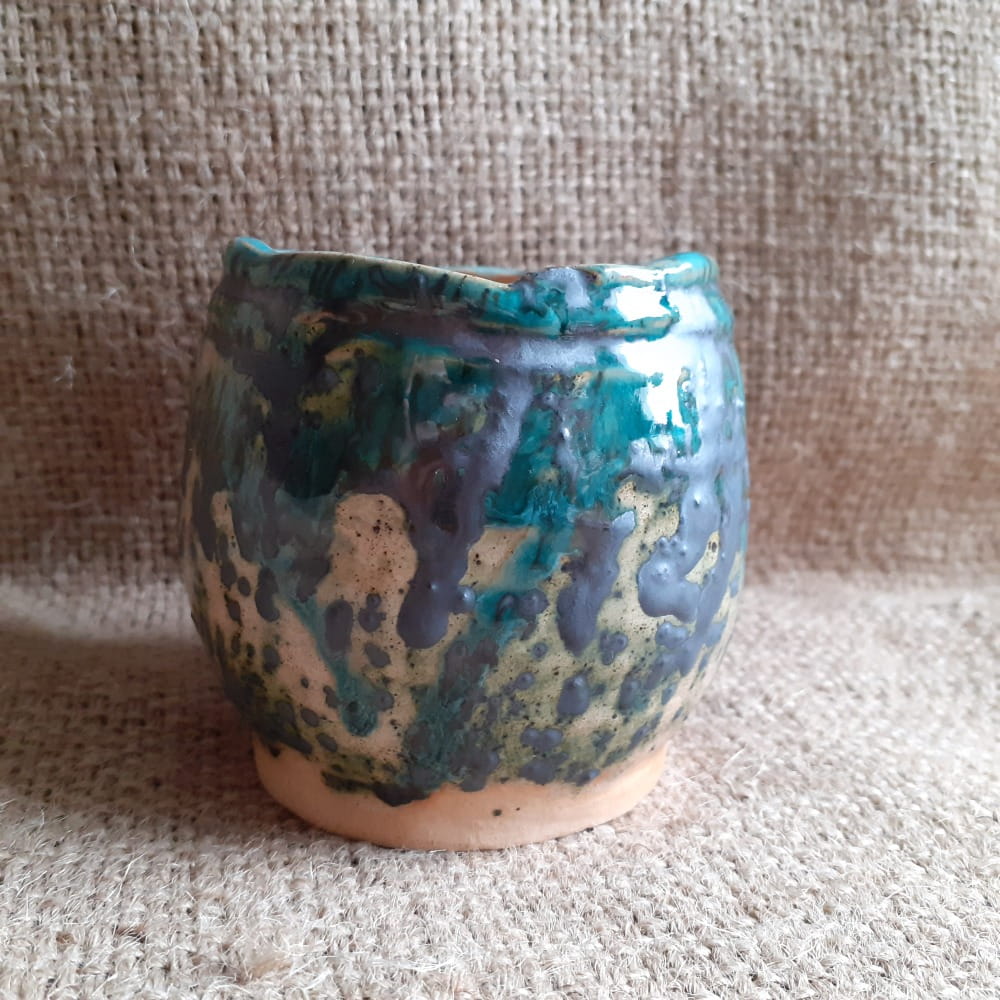Ceramiczna tykwa do yerba mate o wyrazistych, ziemisto- turkusowych barwach. Wnętrze wykończone transparentnym szkliwem, dzięki czemu widzimy naturalną barwę gliny.
