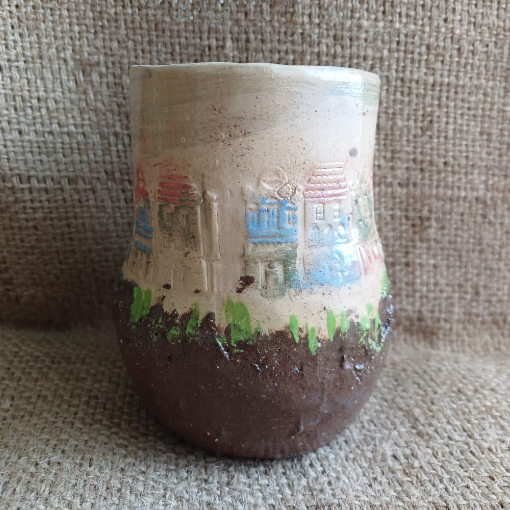 Ceramiczna tykwa do yerba mate stworzona z dwóch rodzajów gliny, ozdobiona kamieniczkami malowanymi angobami. Naczynie wygląda jak miasto wybudowane na skale. Całość pokryta transparentnym szkliwem, dzięki czemu widzimy naturalną barwę gliny. Podpisana nazwą producenta.