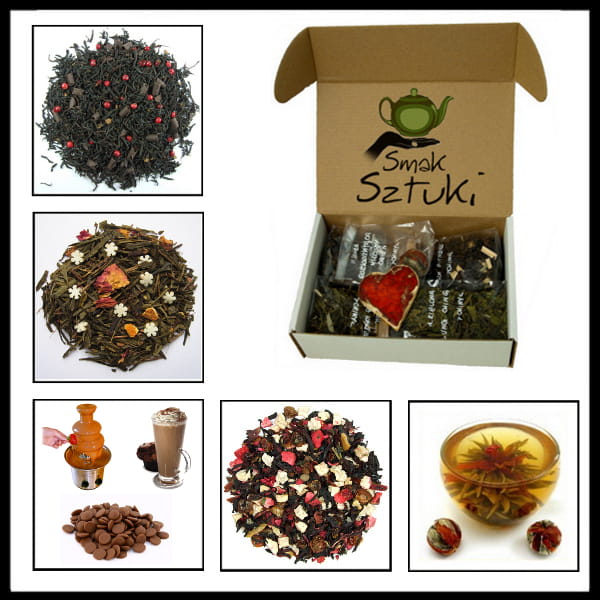 1. Pięć herbat świata zapakowanych w eleganckie torebki, m.in. herbata biała kwitnąca Ogień Miłości.