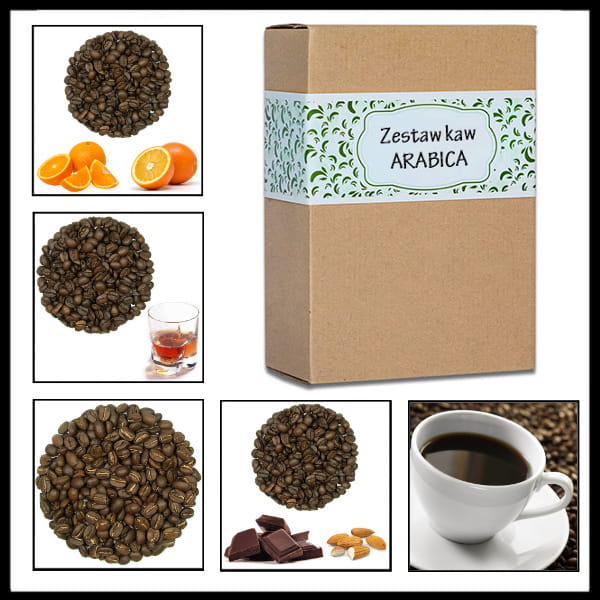 Smaczna Paczka Kawowa XXL Arabica 100% to duży zestaw kaw najwyższej jakości w pudełku typu EKO, zawiera 5 różnych, dużych torebek kaw Arabica 100%.
